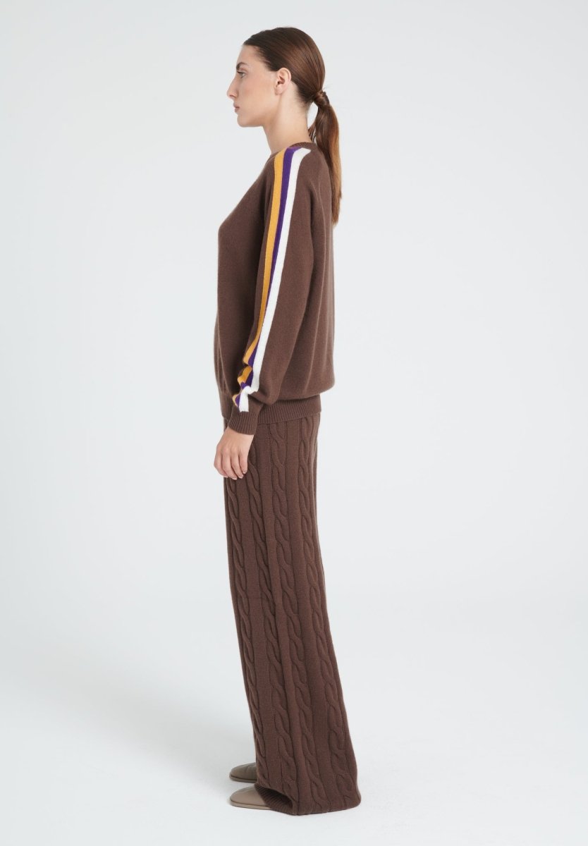 Pull col rond femme en cachemire marron & bande multicolor - ZAYA 19